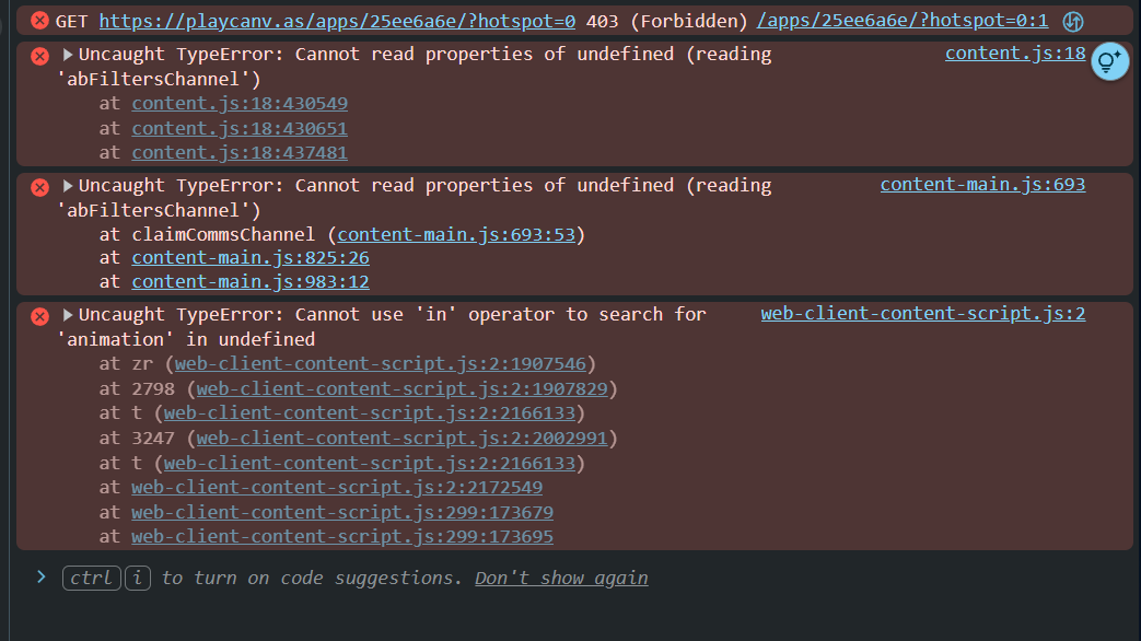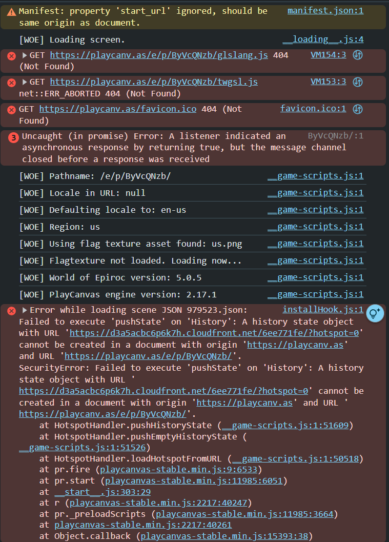 I can go to https://playcanv.as/e/p/ByVcQNzb/ and it resolves to https://playcanv.as/apps/25ee6a6e/?hotspot=0 which is fine. I can click around, end up at other hotspots but wheneven I try to type another hotsot in the address field and press enter I get this error. Or if I just select the url and press enter as if to resubmit it. Error appears.
