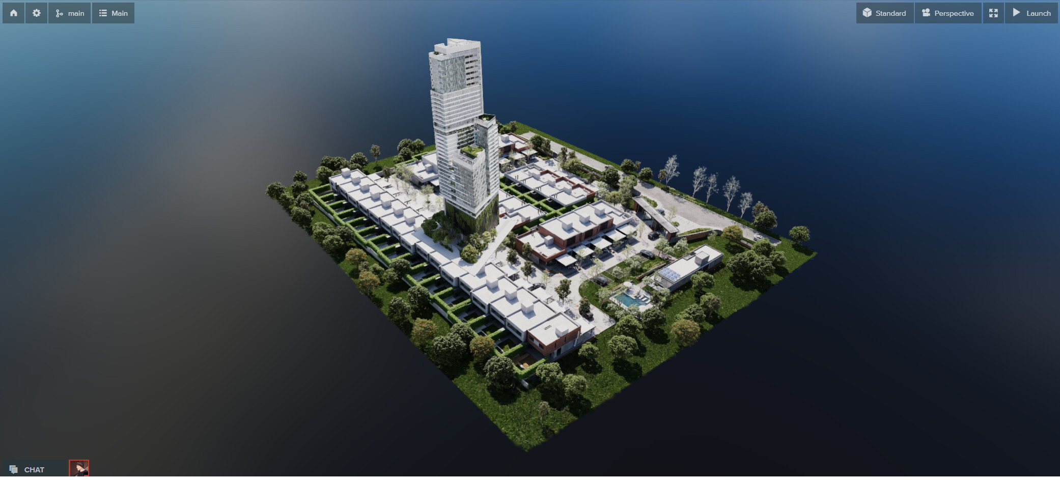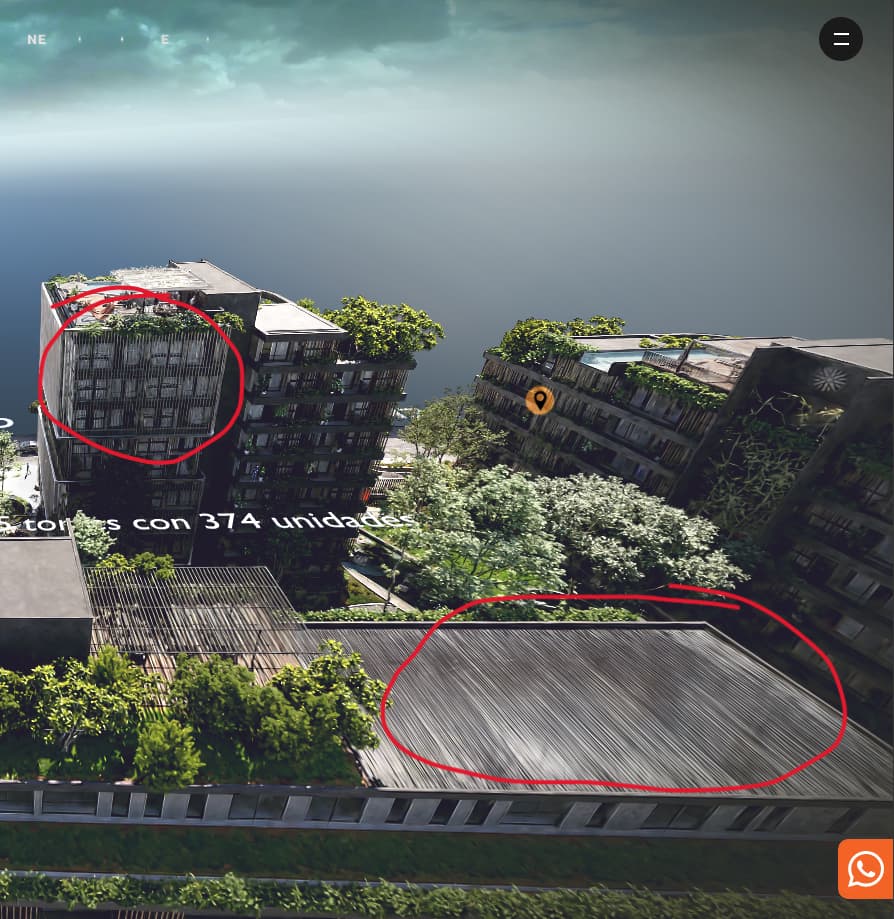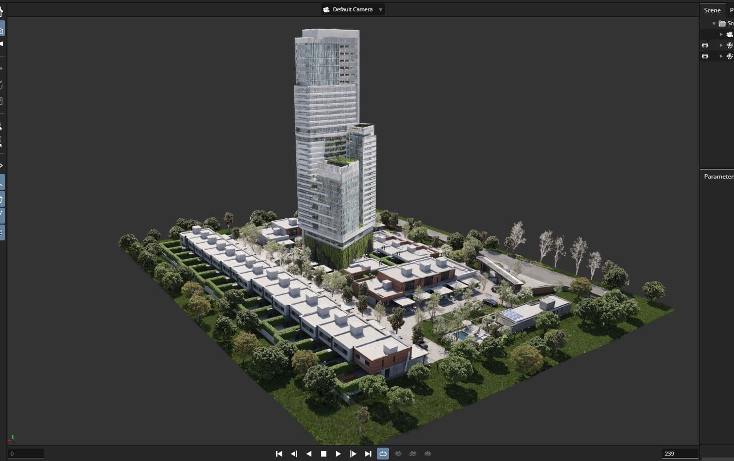 In the following image we can see how the building, which is a Gaussian splat, blends correctly with the group of houses below, which is another splat.