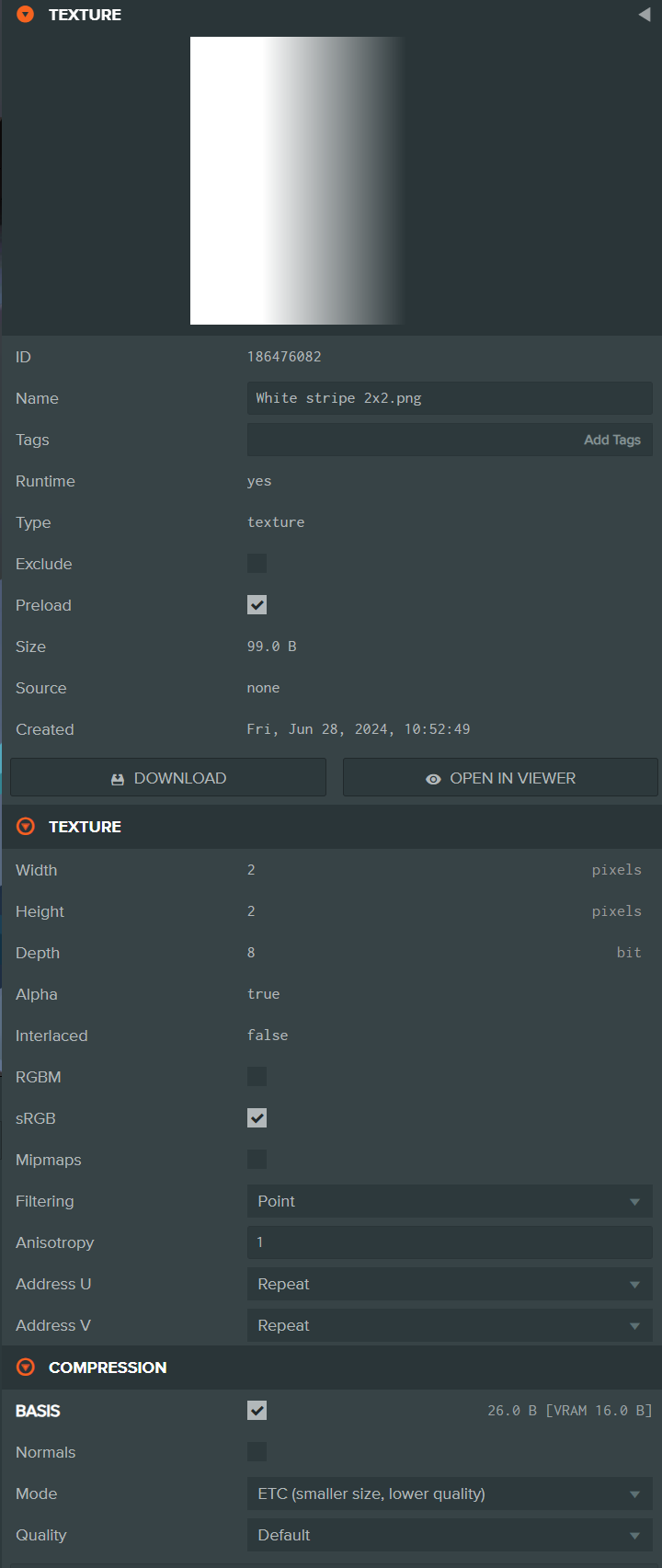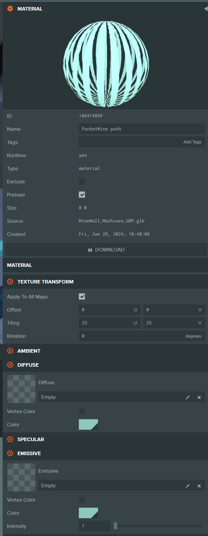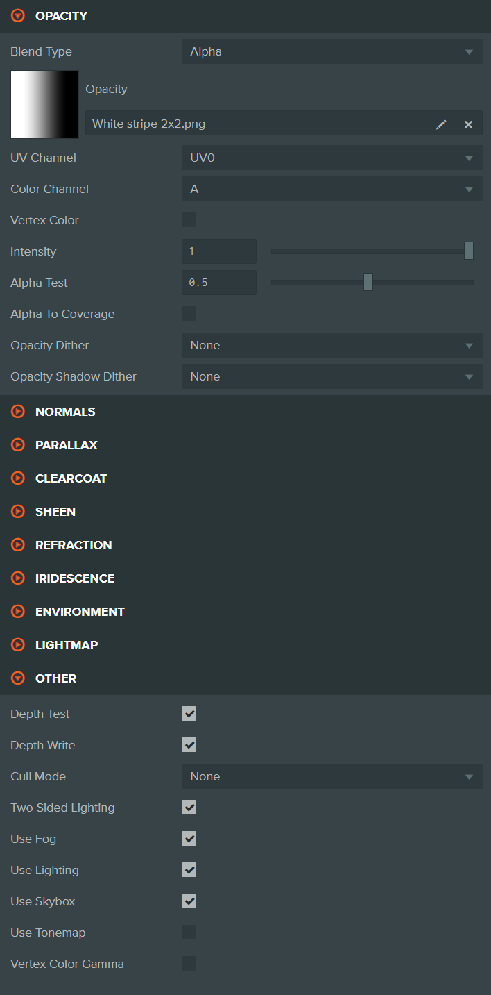 {"shader":"blinn","blendType":2,"cull":0,"useLighting":true,"twoSidedLighting":true,"useMetalness":true,"useMetalnessSpecularColor":false,"depthWrite":true,"emissiveTint":true,"glossInvert":true,"clearCoatGlossInvert":false,"sheenGlossInvert":false,"useDynamicRefraction":false,"useSheen":false,"diffuseTint":true,"specularTint":false,"sheenTint":true,"useIridescence":false,"metalness":0,"shininess":100,"opacity":1,"bumpMapFactor":1,"reflectivity":1,"alphaTest":0.5,"clearCoat":0,"clearCoatGloss":1,"clearCoatBumpiness":1,"specularityFactor":1,"refractionIndex":0.666667,"refraction":0,"sheenGloss":0,"thickness":0,"attenuationDistance":0,"emissiveIntensity":1,"iridescence":0,"iridescenceRefractionIndex":0.666667,"iridescenceThicknessMin":0,"iridescenceThicknessMax":0,"ambient":[1,1,1],"diffuse":[0.5254901960784314,0.7843137254901961,0.7372549019607844],"emissive":[0.5254901960784314,0.7843137254901961,0.7372549019607844],"specular":[1,1,1],"sheen":[1,1,1],"attenuation":[1,1,1],"ambientTint":true,"aoMapChannel":"r","aoMapUv":0,"aoMapTiling":[25,25],"aoMapOffset":[0,0],"aoMapRotation":0,"diffuseMapChannel":"rgb","diffuseMapUv":0,"diffuseMapTiling":[25,25],"diffuseMapOffset":[0,0],"diffuseMapRotation":0,"specularMapChannel":"rgb","specularMapUv":0,"specularMapTiling":[25,25],"specularMapOffset":[0,0],"specularMapRotation":0,"specularAntialias":true,"occludeSpecular":1,"specularityFactorMap":null,"specularityFactorMapChannel":"r","specularityFactorMapUv":0,"specularityFactorMapTiling":[25,25],"specularityFactorMapOffset":[0,0],"specularityFactorMapRotation":0,"enableGGXSpecular":false,"anisotropy":0,"metalnessMapChannel":"r","metalnessMapUv":0,"metalnessMapTiling":[25,25],"metalnessMapOffset":[0,0],"metalnessMapRotation":0,"conserveEnergy":true,"glossMapChannel":"r","glossMapUv":0,"glossMapTiling":[25,25],"glossMapOffset":[0,0],"glossMapRotation":0,"clearCoatMapChannel":"r","clearCoatMapUv":0,"clearCoatMapTiling":[25,25],"clearCoatMapOffset":[0,0],"clearCoatMapRotation":0,"clearCoatVertexColor":false,"clearCoatVertexColorChannel":"r","clearCoatGlossMapChannel":"r","clearCoatGlossMapUv":0,"clearCoatGlossMapTiling":[25,25],"clearCoatGlossMapOffset":[0,0],"clearCoatGlossMapRotation":0,"clearCoatGlossVertexColor":false,"clearCoatGlossVertexColorChannel":"r","clearCoatNormalMapUv":0,"clearCoatNormalMapTiling":[25,25],"clearCoatNormalMapOffset":[0,0],"clearCoatNormalMapRotation":0,"sheenMap":null,"sheenMapChannel":"rgb","sheenMapUv":0,"sheenMapTiling":[25,25],"sheenMapOffset":[0,0],"sheenMapRotation":0,"sheenGlossMap":null,"sheenGlossMapChannel":"r","sheenGlossMapUv":0,"sheenGlossMapTiling":[25,25],"sheenGlossMapOffset":[0,0],"sheenGlossMapRotation":0,"emissiveMapChannel":"rgb","emissiveMapUv":0,"emissiveMapTiling":[25,25],"emissiveMapOffset":[0,0],"emissiveMapRotation":0,"normalMapUv":0,"normalMapTiling":[25,25],"normalMapOffset":[0,0],"normalMapRotation":0,"refractionMap":null,"refractionMapChannel":"r","refractionMapUv":0,"refractionMapTiling":[25,25],"refractionMapOffset":[0,0],"refractionMapRotation":0,"refractionVertexColor":false,"refractionVertexColorChannel":"r","dispersion":0,"thicknessMap":null,"thicknessMapChannel":"r","thicknessMapUv":0,"thicknessMapTiling":[25,25],"thicknessMapOffset":[0,0],"thicknessMapRotation":0,"thicknessVertexColor":false,"thicknessVertexColorChannel":"r","iridescenceMap":null,"iridescenceMapChannel":"r","iridescenceMapUv":0,"iridescenceMapTiling":[25,25],"iridescenceMapOffset":[0,0],"iridescenceMapRotation":0,"iridescenceThicknessMap":null,"iridescenceThicknessMapChannel":"r","iridescenceThicknessMapUv":0,"iridescenceThicknessMapTiling":[25,25],"iridescenceThicknessMapOffset":[0,0],"iridescenceThicknessMapRotation":0,"heightMapChannel":"r","heightMapUv":0,"heightMapTiling":[25,25],"heightMapOffset":[0,0],"heightMapRotation":0,"heightMapFactor":1,"alphaToCoverage":false,"alphaFade":1,"opacityMap":"../186476082/White stripe 2x2.png","opacityMapChannel":"a","opacityMapUv":0,"opacityMapTiling":[25,25],"opacityMapOffset":[0,0],"opacityMapRotation":0,"opacityFadesSpecular":true,"opacityDither":"none","opacityShadowDither":"none","cubeMapProjection":0,"cubeMapProjectionBox":{"center":[0,0,0],"halfExtents":[0.5,0.5,0.5]},"lightMapChannel":"rgb","lightMapUv":0,"lightMapTiling":[25,25],"lightMapOffset":[0,0],"lightMapRotation":0,"depthTest":true,"useFog":true,"useSkybox":true,"useGammaTonemap":true,"anisotropyIntensity":0,"anisotropyRotation":0,"metalnessTint":true,"sheenGlossTint":true,"mapping_format":"path"}