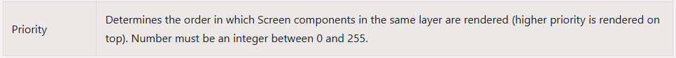 Also, the Editorās field for priority on a screen component is not allowing to set it larger than 127 for some reason. Thatās a bug, but shouldnāt be related to this (probably?). I will create an issue for that.